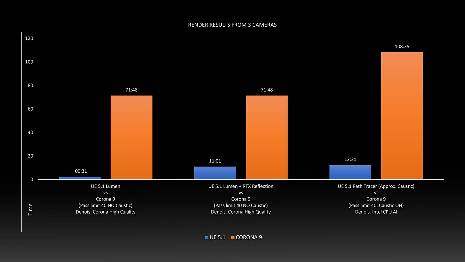 Comparing the results, I found that the Path Tracing mode in Unreal Engine was nearly 9 times faster than the Corona render, completing the task in just 12 minutes and 31 seconds. While the Corona render displayed detailed reflections and refractions, it contained numerous artifacts. On the other hand, the Unreal Engine render lacked some details but presented impressive quality and minimal artifacts considering the time spent.